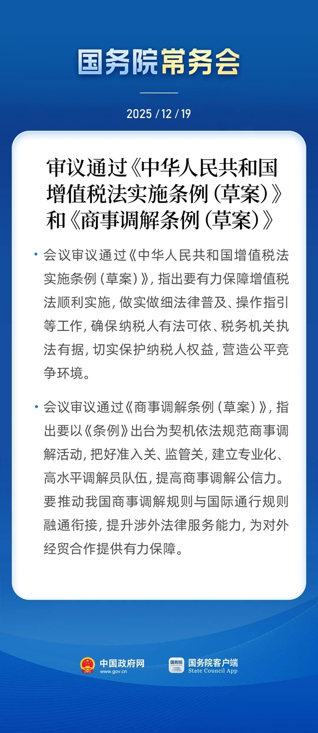 国务院常务会审议通过《中华人民共和国增值税法实施条例(草案)》和《商事调解条例(草案)》